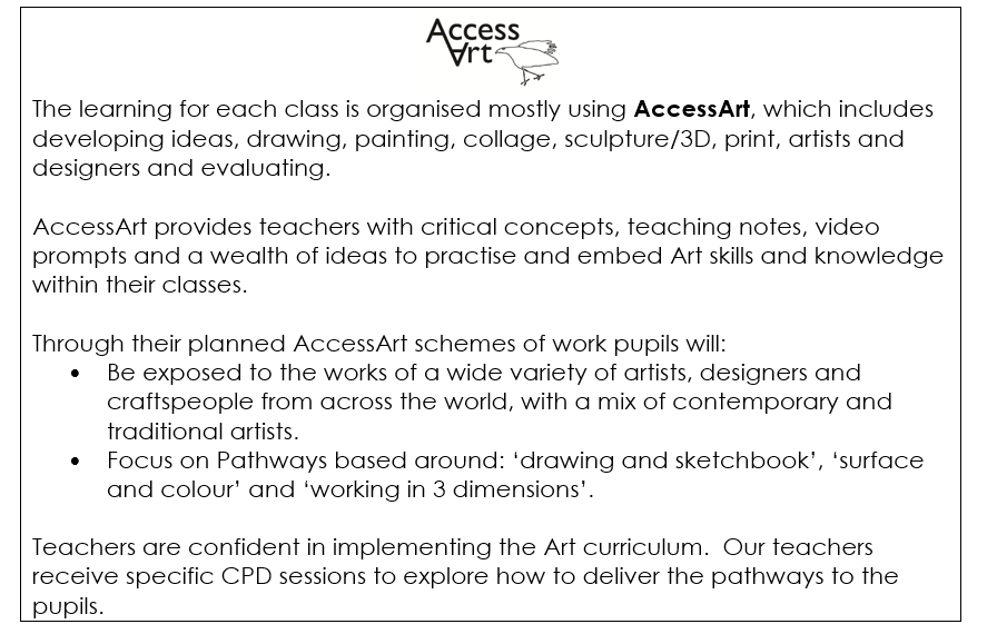 Our Art and Design curriculum is based on the National Curriculum, and is informed by AccessArt’s ‘split’ curriculum https://www.accessart.org.uk/split-accessart-primary-art-curriculum/. Art and Design and Design and Technology are taught alternatively each half-term.